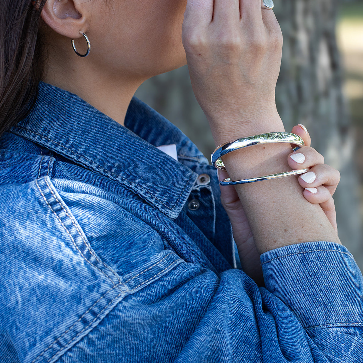 Handmade solid sterling silver bangle crafted from 8mm × 4mm oval-shaped wire.