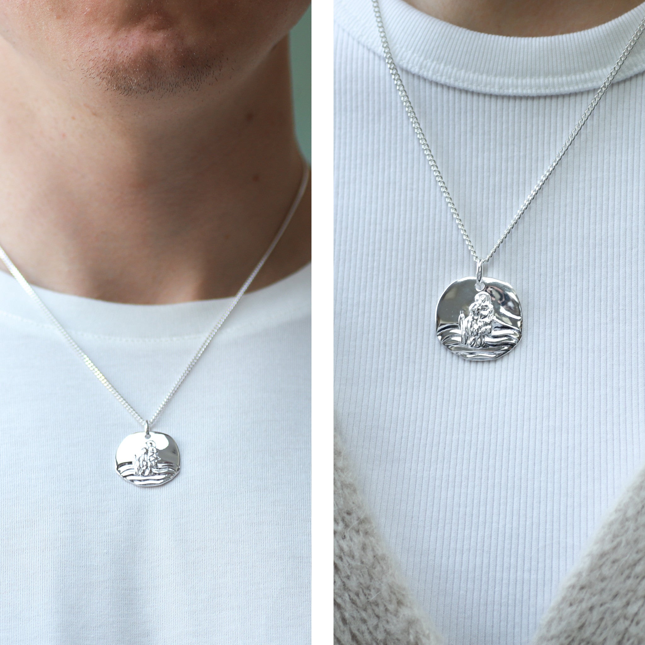This Molten St. Christopher necklace features an irregular, organic outline inspired by the smooth surface of a washed-up pebble. Substantial in weight and satisfyingly tactile, the medal measures 23mm across and carries a soft St. Christopher design at the centre.