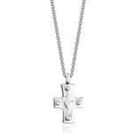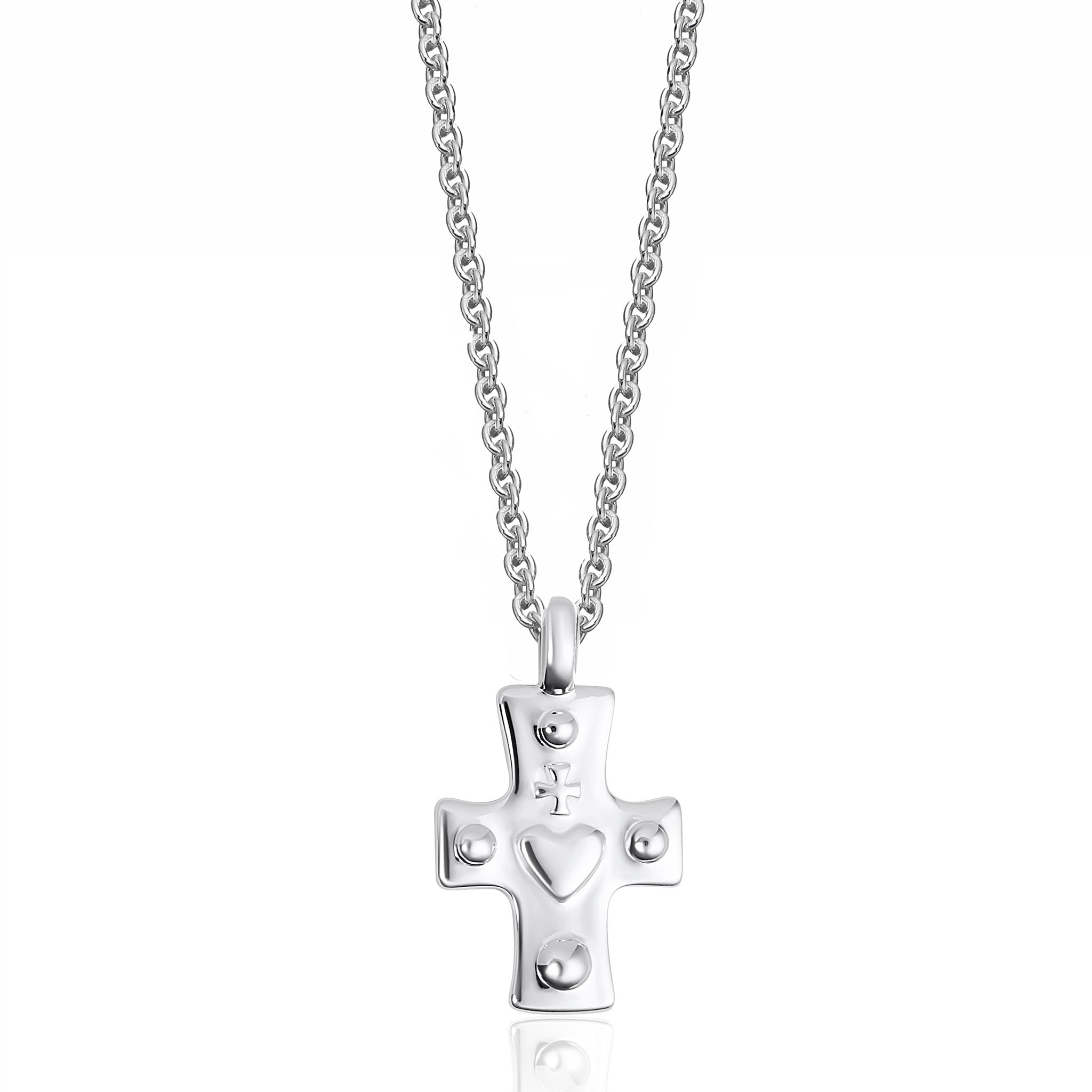An unusual sterling silver cross with an embossed heart in the centre. The pendant has a timeless form and reassuring weight, designed to be worn and kept.