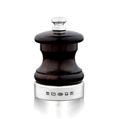 Blackwood body turned from oboe block offcuts. Silver bands hallmarked at the London Assay Office.