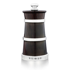Handcrafted salt mill in sterling silver and blackwood, shaped like a traditional butter churn.