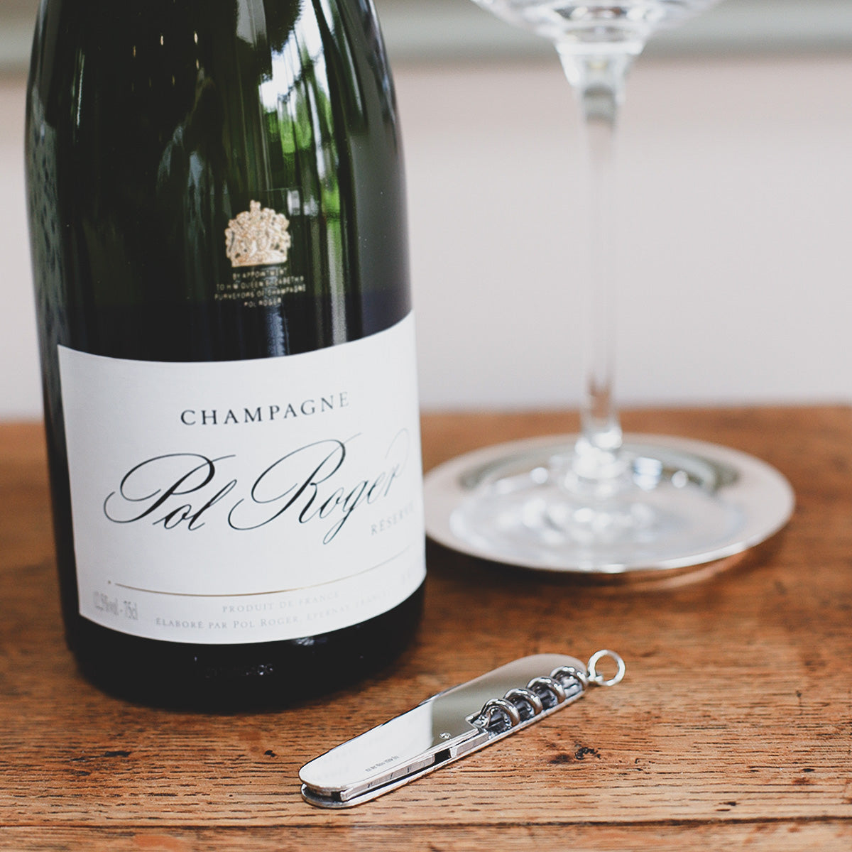 Sterling silver-handled corkscrew with integrated foil cutter and bottle opener. The handle can be engraved with a name, initials, or a short message.