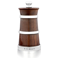 Victorian milk churn style salt mill with sterling silver bands and rosewood body.