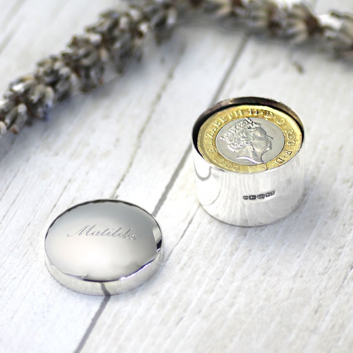 Made in sterling silver, this tooth box is designed for storing baby teeth and is a suitable gift for children. It measures 24mm in diameter and 19mm high, and can also hold up to five £1 coins.