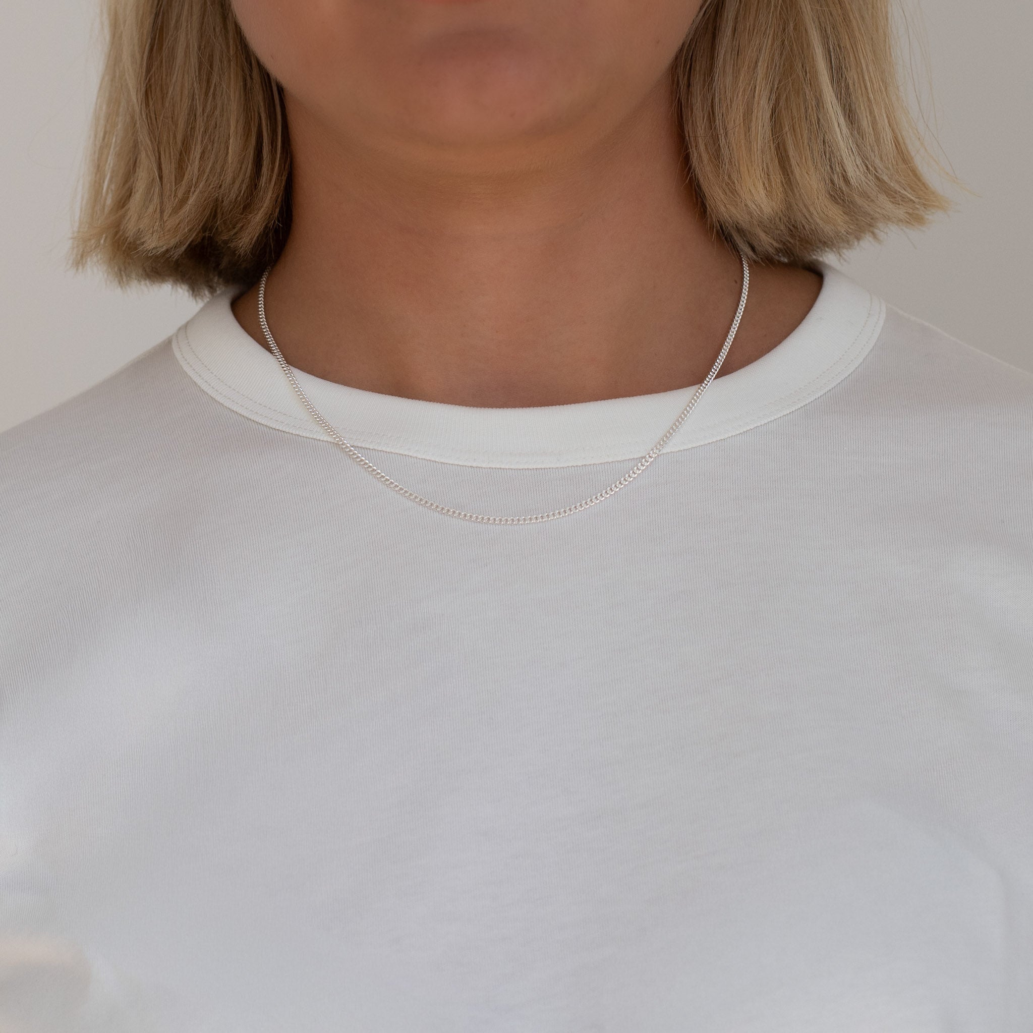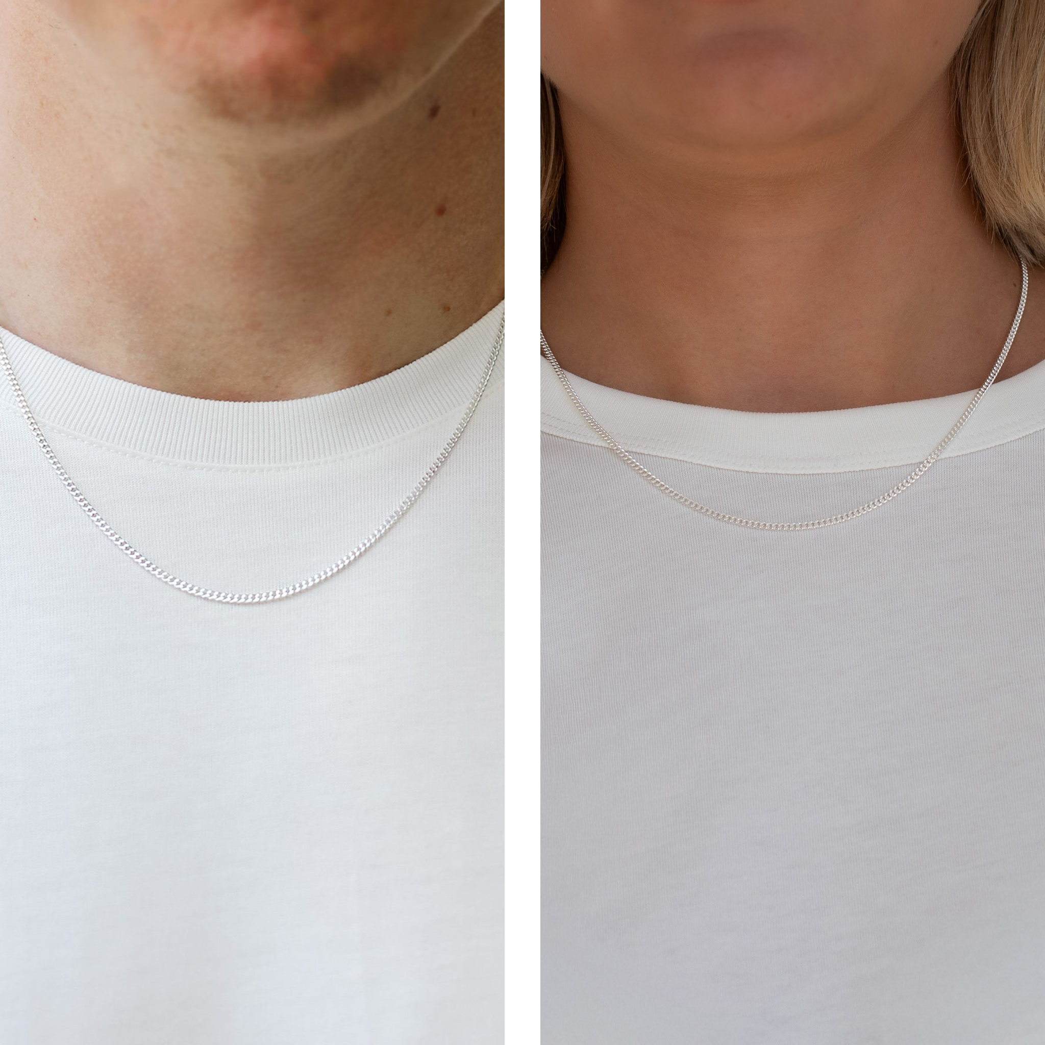 This sterling silver curb chain features interlocking, uniform links that lie flat, creating a strong and comfortable design. Also known as a Cuban chain, it is finished with a secure lobster clasp.