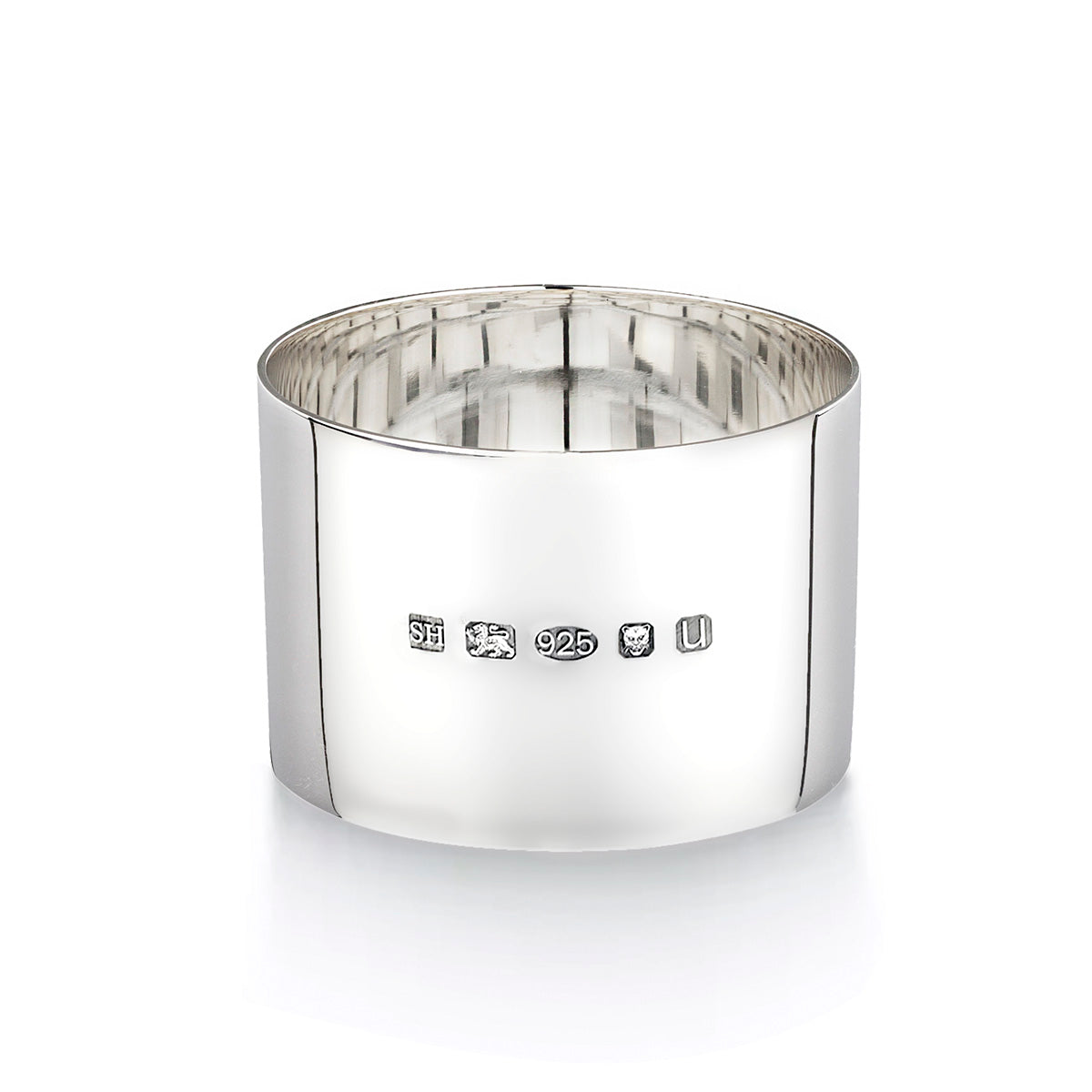 Handcrafted sterling silver napkin ring, weighing 28g and measuring 30mm high × 45mm wide.