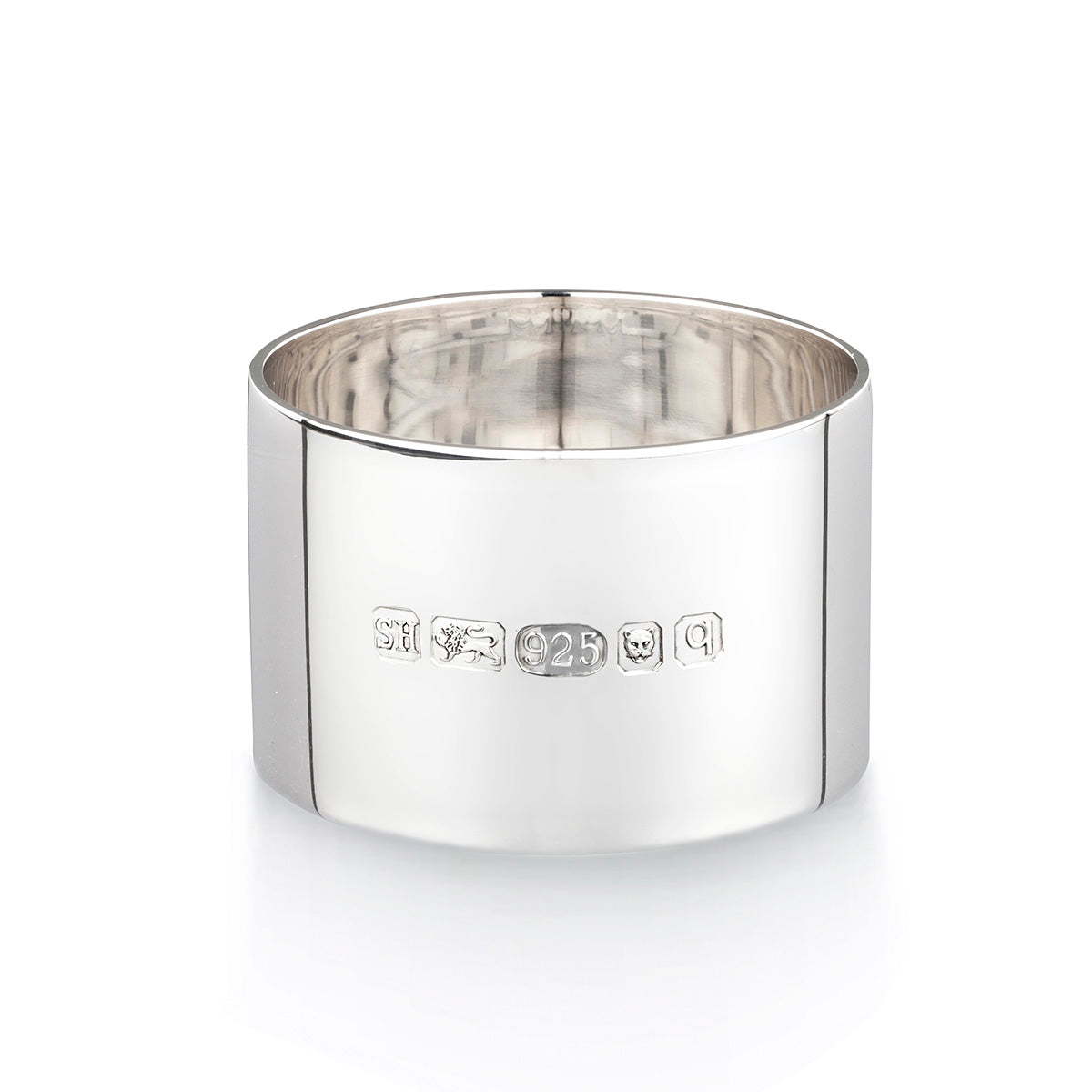 This sterling silver napkin ring weighs over 60g and measures 30mm in height and 46mm in width. Hallmarked in London.