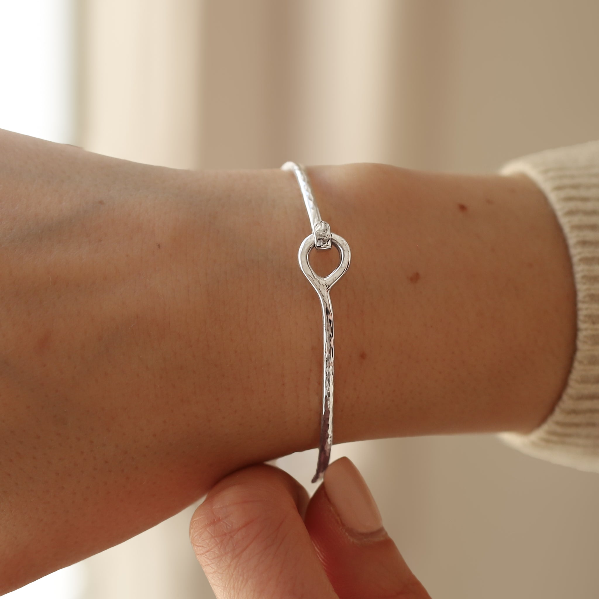 A solid sterling silver bangle with a softly hammered finish, secured with a forged hook-and-eye clasp for a close, comfortable fit. Handmade in our workshops, it has a subtle texture and a clean, understated profile.
