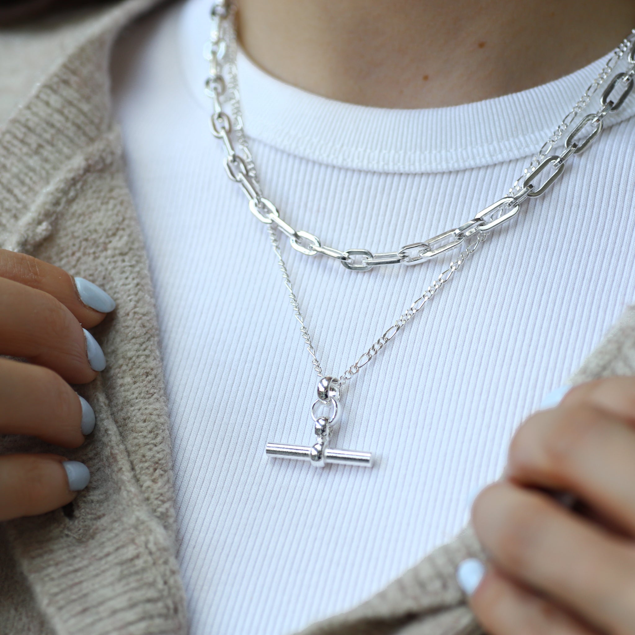 The silver paperclip chains are robust and fitted with a large, high-quality lobster clasp for added security.