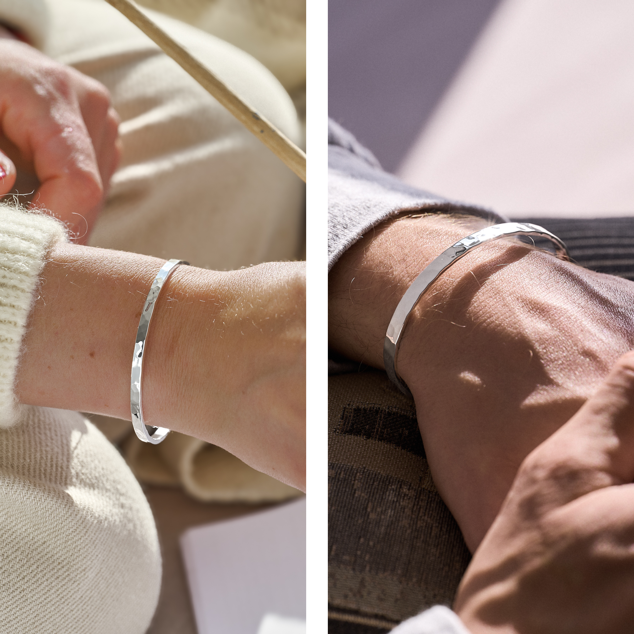 This lovely cuff bangle is for small to larger ladies wrist sizes and the malleable silver allows for slight adjustments by gently squeezing the ends closer or opening them slightly wider.