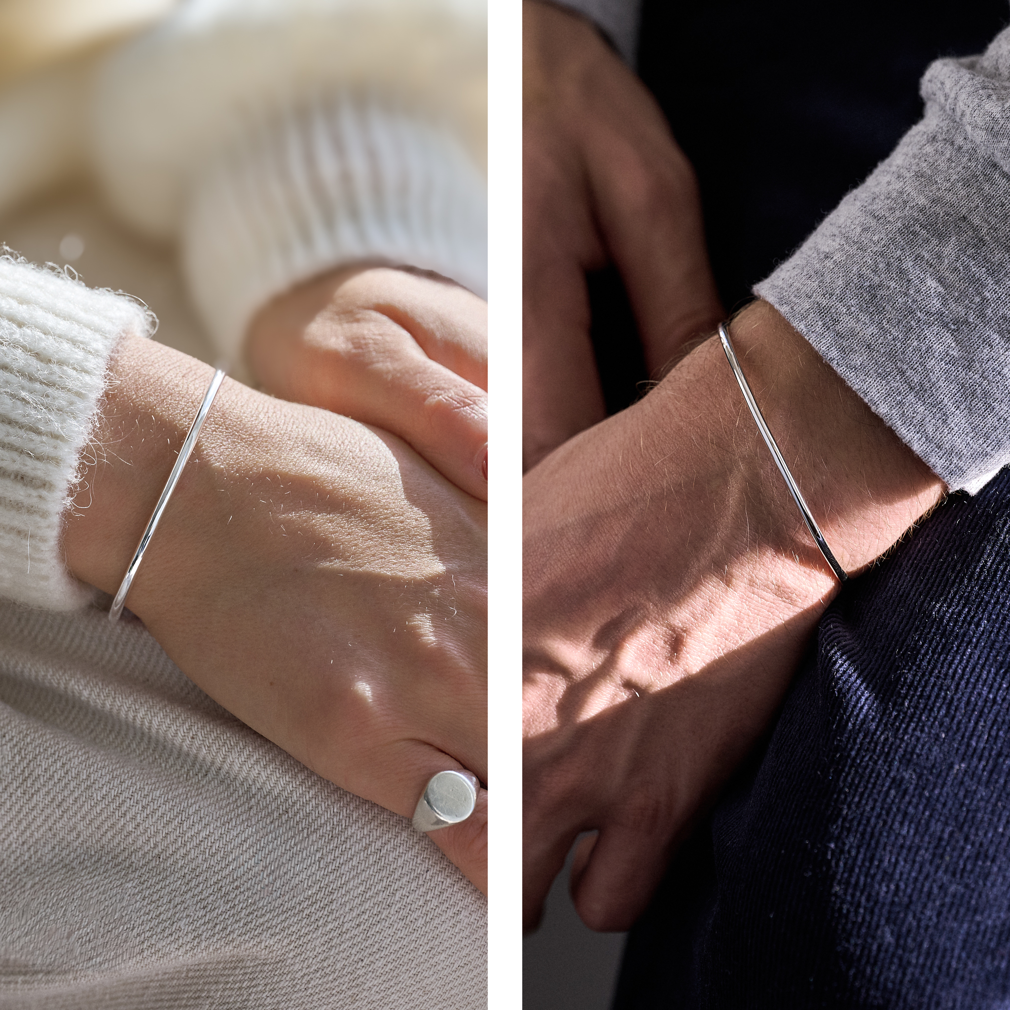 Close-up of a person's hands with a silver ring and bracelet, wearing a white sweater.