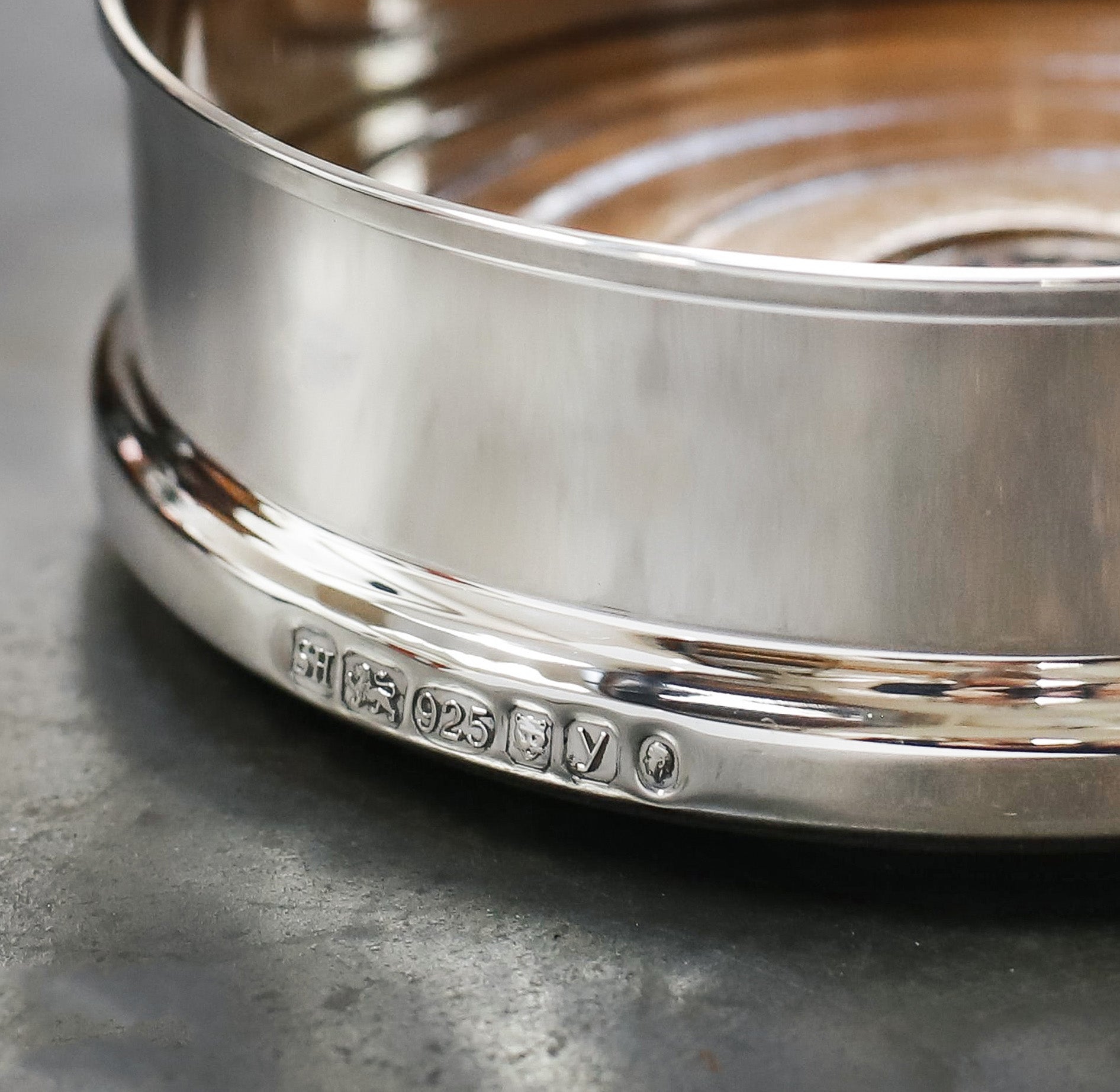 The millesimal fineness (purity) of the precious metal content in parts per 1000. In this example 925 parts per 1000 (92.5%) represents the sterling silver standard recognised in the UK. The lion passant is a voluntary mark.