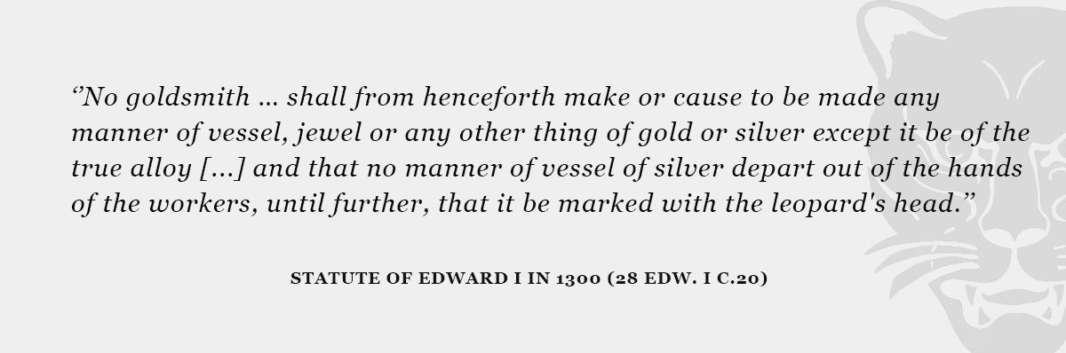 The hallmark is one of the oldest forms of consumer protection in the world and its history can be dated as far back as 1300, when Edward I demanded that all work in precious metals be struck with the leopard's head mark which is still the symbol of the London Assay Office today.