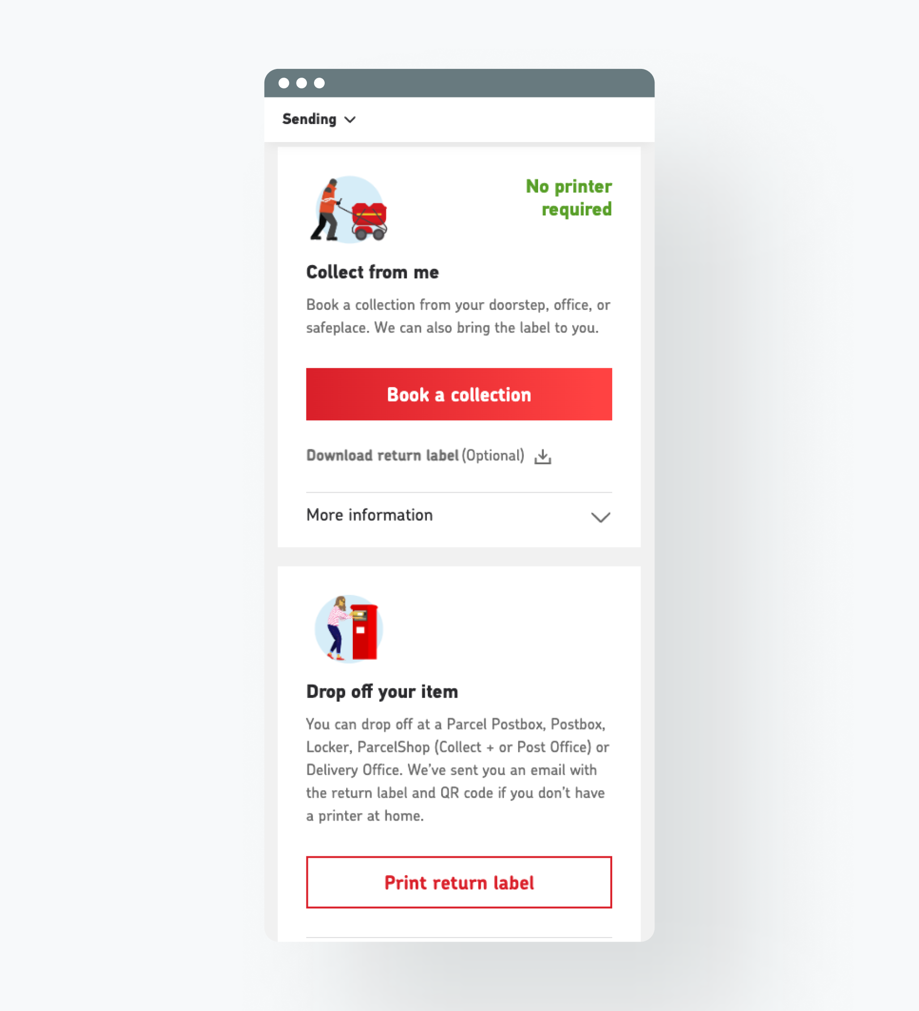 - Collection: Book a collection from your location. The label can be brought to you (No printer required).