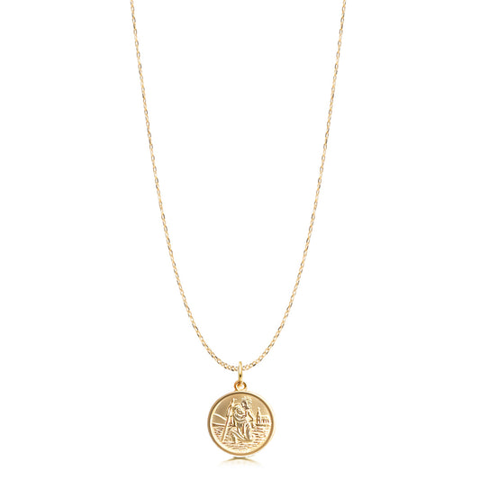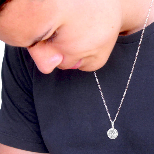 This sterling silver necklace features a circular St. Christopher motif on a rectangular background.