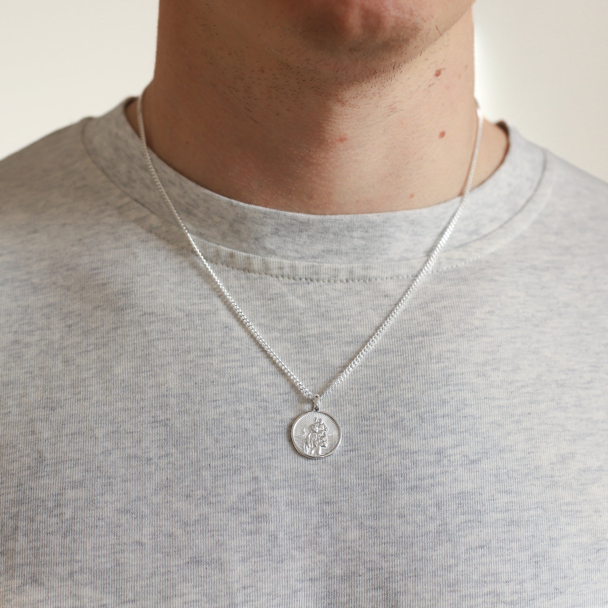 A modern sterling silver St. Christopher pendant with a perfectly imperfect edge for a tactile finish.