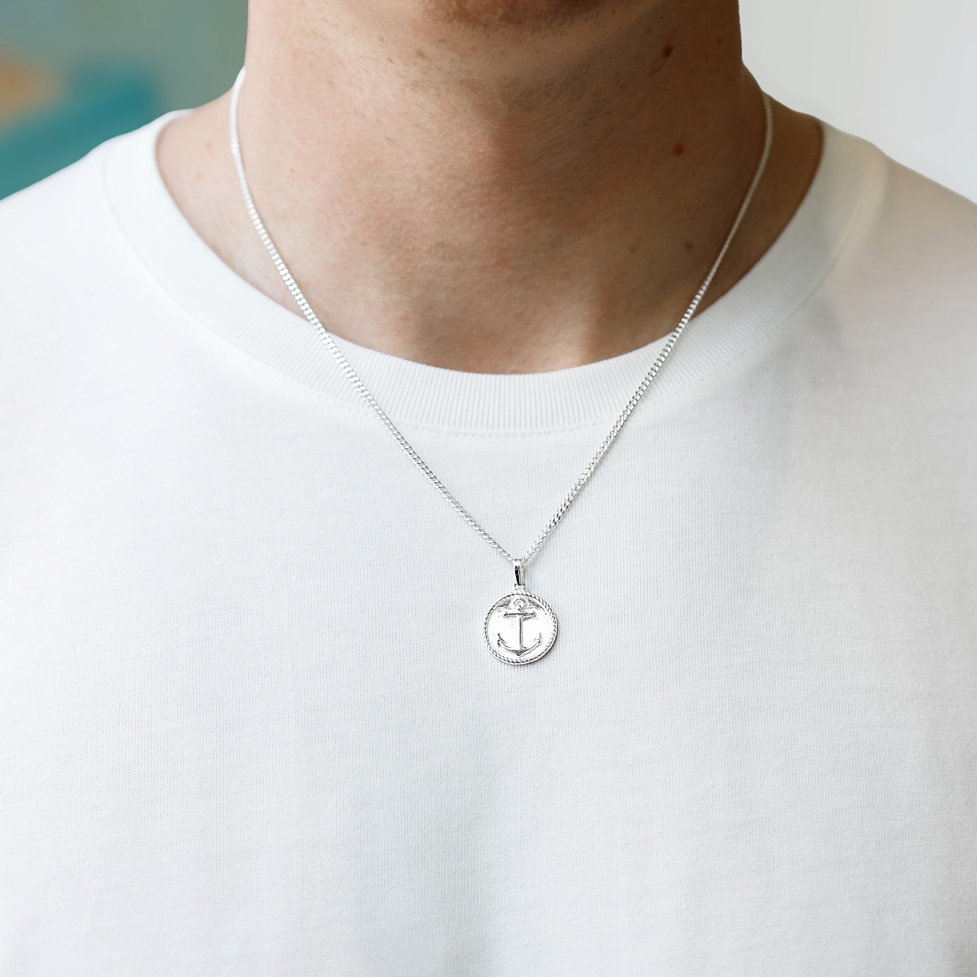Sterling silver anchor with a plain background and rope surround. Can be engraved with a message on the reverse.